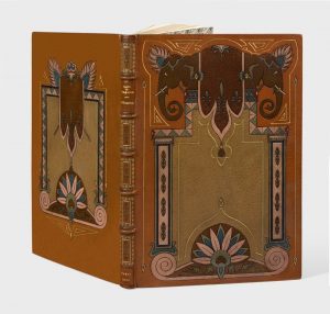 têtes d’éléphants sur le premier plat, variante du même décor, réduit sur le deuxième plat, tranches dorées, doublure de maroquin mauve ornée d’un large encadrement de filets dorés et d’une bordure mosaïquée, gardes de soie brochée, dos mosaïqué, couverture et dos, étui (H. Blanchetière).