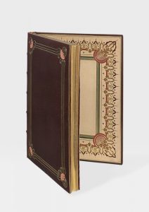 tranches dorées, doublure de maroquin ivoire comportant un important décor polychrome mosaïqué et doré dans le goût oriental, gardes de reps vert bronze, doubles gardes, couverture et dos, étui (David, 1907).