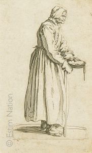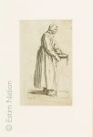 Jacques CALLOT (1592-1635) "La mendiante à la Sébile" Eau-forte, planche de la série des Gueux Dimensions à vue 15.5 x 9,4 cm, encadrée sous verre (Découpée au sujet et recollée) Bibliographie : "Jacques Callot" Ed. RMN, Paris 1992. Ref....