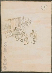 Katsushika HOKUSAI (1760-1849) "Scène de la vie quotidienne et paysage" de la série Hokusaï manga Gravure sur bois imprimées en trois couleurs contrecollée en partie, 1815-1840 Dimensions 19.7 x 14.2 cm Provenance : Galerie Sartoni & Cerveau,...