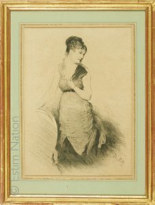 Giuseppe de NITTIS (1846-1884) "Gabrielle", 1876 Pointe-sèche signée dans la planche en bas à droite Porte un numéro d'inventaire au dos Dimensions à vue 21,4 x 15,5 cm, encadrée sous verre (jaunissement)