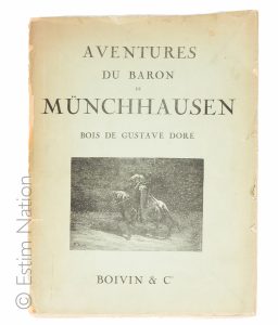 BARON MUNCHHAUSEN Aventures du Baron de Münchhause, traduction nouvelle par Théophile Gautier Fils, illustrations bois gravé de Gustave Doré, Paris éditions Boivin et Cie. 1 volume in-4 broché. Accidents à la couverture et au dos.