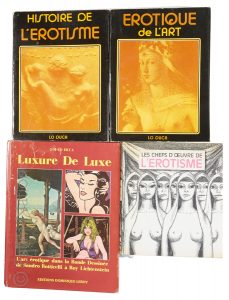 CURIOSA Ensemble de quatre ouvrages érotiques.1.Histoire de l'érotisme.2.Erotique de l'art.3. Les chefs-d'œuvre de l'érotisme.4.Luxure de luxe ( bande dessinée érotique ).En état moyen.