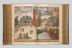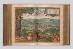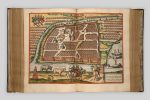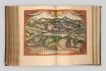– tome V : titre-frontispice gravé, un feuillet blanc, 8 feuillets de préface qui se termine par un acrostiche en latin révélant le nom de Georg Braun, 68 planches à double page et un grand plan hors texte de la ville d’Anvers (la double page n°27 est une notice sur Anvers) ; la planche n°13 qui est une vue de Grenade, datée 1565, présente une cassure visible sur le bord supérieur du cuivre.