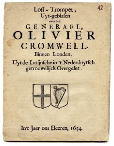 CROMWELL. — [MENEZÈS (Joâo Rodrigues de Sa e)]. Loff-Trompet, Uyt-Geblasen over den generael, Olivier Cromwell, Binnen Londen. S.l.n.n., In’t Jaer ons Heeren, 1654. Plaquette in-4, dérelié.