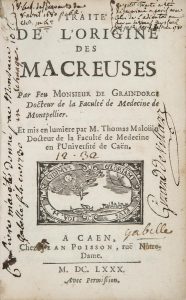 L’auteur (1616-1676), médecin originaire de Caen qui professa à Montpellier et à Narbonne, fut l’ami du poète normand Pierre-Daniel Huet. Dans cet ouvrage singulier, que Gérard Oberlé a joliment qualifié d’oiseau rare de la bibliophilie, il examine les origines de la macreuse et réfute au passage la théorie aristotélicienne de la génération spontanée, ou abiogenèse.