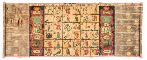 Peinture à la fois naïve et pleine de charme, dont les 36 cases numérotées (7 x 8 cm), peintes dans des tons vifs, figurent différentes espèces de fruits (figue, pomme, poire, fraise ou cerise), des fleurs (rose, tulipe, iris, etc.), et des personnages en costume (bergers, musiciens, jardiniers, etc.).