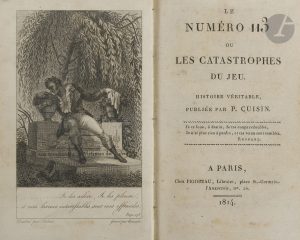CUISIN (J.-P.-R.). — Le Numéro 113 ou la Catastrophe du jeu. Histoire véritable. — Paris : Pigoreau, 1814. — In-12, 158 x 96 : frontispice, (2 ff.), xj, 174 pp. — Demi-percale violine mouchetée à la bradel, dos lisse (reliure de la fin du...
