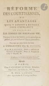 LAUGIER. — Réforme des courtisannes (sic), ou les avantages qu’il y auroit à retirer pour l’humanité de proscrire les femmes de mauvaise vie, Tant pour la santé des hommes qui les approchent en général, que pour le bien de l’Etat en...