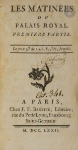 LES MATINÉES DU PALAIS ROYAL. — Paris : J. F. Bastien, 1772. — 2 volumes in-12, 136 x 80 : (1 f.), 201 pp. ; (1 f.), 219 pp., (1 f.). — Basane marbrée, dos lisse orné, tranches rouges (reliure de l’époque).