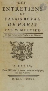 MERCIER (Louis-Sébastien). — Les Entretiens du Palais-Royal de Paris. — Paris : Buisson, 1786. — In-8, 189 x 116 : 204 pp. — Cartonnage de papier marbré, dos lisse, tranches mouchetées (reliure du début du XIXe siècle).