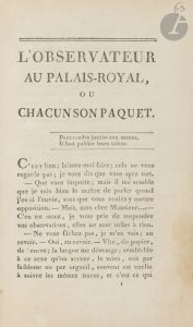 L’OBSERVATEUR AU PALAIS ROYAL, OU CHACUN SON PAQUET. — [Paris : imprimerie de Patris, 1817]. — Brochure in-8, 196 x 126 : 8 pp. — Cartonnage papier marbré vert moderne.