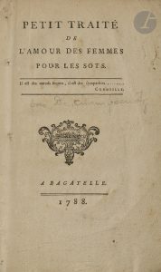 Petit traité de l’amour des femmes pour les sots. A Bagatelle, 1788. — In-8, 44 pp., (2 ff. blancs), couverture muette. En feuilles, débroché.