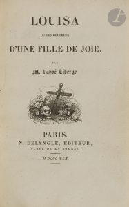 RÉGNIER-DESTOURBET (Hippolyte-François)]. — Louisa ou les douleurs d’une fille de joie. — Par M. l’Abbé Tiberge. — Paris : N. Delangle, 1830. — 2 volumes in-16, 145 x 96 : (2 ff.), XVI, 166 pp. ; (2 ff.), 176 pp. — Demi-maroquin...