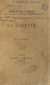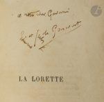 GONCOURT (Edmond et Jules de). — La Lorette. — Paris : Dentu, 1853. — In-32, 110 x 72 : (34 ff.), couverture imprimée. — Maroquin rouge janséniste, dos lisse, tête dorée, non rogné, couverture conservée (reliure moderne).