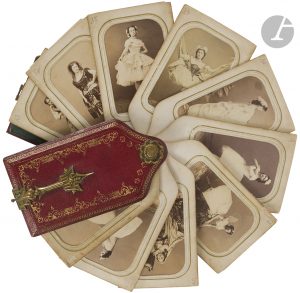 Joli album dans un format très particulier, en éventail, réunissant 20 photographies originales sur papier albuminé de format carte de visite, représentant des actrices, des danseuses et des lorettes.