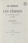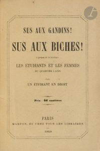 • Sus aux Gandins ! Sus aux Biches ! à propos de la brochure Les Étudiants et les femmes Du quartier latin en 1860 par un étudiant en droit. Paris : typographie de Cosson et comp., 1860. — In-32, 139 x 95 : 45 pp. mal chiffrées 49, (1 f.), couverture imprimée. Demi-percaline bleue à la bradel, dos lisse, non rogné, couverture conservée (reliure vers 1880).
