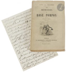 [ROSE-POMPON] VALLIÈRES (Louis de). — Les Mémoires de Rose Pompon. — Paris : Librairie Gennequin fils, [1877]. — In-18, 186 x 118 : (2 ff.), 283 pp., couverture illustrée. — Broché.