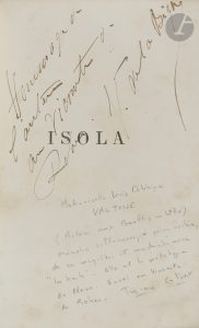 VALTESSE DE LA BIGNE (sous le pseudonyme de EGO (en grec)). Isola. — Paris : E. Dentu, 1876. — In-18, 187 x 120 : (3 ff.), 234, 8 pp., couverture imprimée. — Broché.