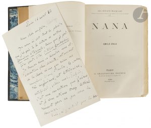 Exemplaire enrichi d’une belle L.A.S. de l’auteur adressée au romancier Robert Caze (1853-1886), Paris 16 avril 1885, 2 pages in-8. Zola donne son avis sur deux ouvrages de ce dernier : Semaine d’Ursule (1885) et L’Élève Gendrevin (1884).