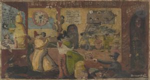 La scène représentée ici, peut-être réalisée par l’un des voyous ou truands qui fréquentaient ces bals, est très intéressante. On y voit un bar à gauche où il est noté :