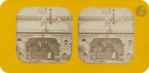 Bel ensemble de 9 photographies stéréoscopiques en couleurs réalisées par le photographe Charles Gaudin (1825-1905), représentant différentes vues, extérieures et intérieures, de la Closerie des Lilas.