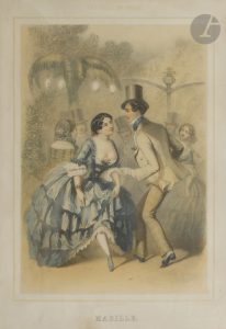 Belle lithographie en couleurs de Charles Vernier et Bettanier d’après un dessin de Charles Vernier, représentant un couple de danseurs au bal Mabille.
