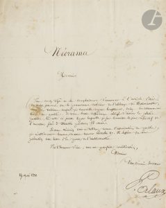 « Je prend Beaucoup d’intérêt à M. Alaux porteur de la présente, peintre très adonné à la perfection de l’art. Il a conçu le projet d’un petit spectacle d’un genre nouveau qui me semble devoir y contribuer, mon dessein est d’en parler au Ministre, Mais auparavant j’ai désiré que M. Alaux vous fit part de son projet, espérant que vous voudrez bien lui donner vos conseils…»