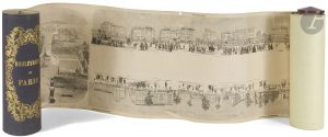 [PANORAMA - RENARD (Édouard)]. — Boulevards de Paris. — Paris : l’Illustration, [1846]. — Panorama de 27,5 x 486 centimètres, collé sur toile et enroulé autour d’un cylindre cartonné avec une extrémité en bois, pièce de percaline...