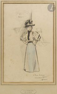 Dessin représentant une dame, peut-être une prostituée, attendant un client ou un rendez-vous qui apparemment ne vient pas, elle semble inquiète. En arrière-plan figure l’esquisse de 2 personnages.