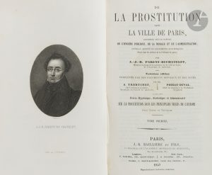 Archives de la Préfecture de Police… — Troisième édition complétée par des documents nouveaux et des notes par MM. A. Trébuchet…, Poirat-Duval… suivie d’un Précis Hygiénique, Statistique et Administratif sur la prostitution dans les principales villes de l’Europe.— Paris : J.-B. Baillière et fils ; Londres, New-York : H. Baillière ; Madrid : C. Bailly-Baillière, 1857. — 2 volumes in-8, 207 x 133 : portrait, XXIII, 732 pp., 2 cartes, 1 tableau ; (2 ff.), 892 pp. — Demi-basane violette, dos lisse orné, chiffre ED en queue, tranches mouchetées (reliure de l’époque).