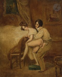 ÉCOLE FRANÇAISE DU XIXe siècle — Scène de boudoir ; Huile sur toile. — 28,5 x 35 cm — Restaurations.