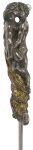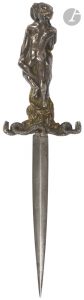 DAGUE DE PROSTITUÉE en bronze à deux patines figurant un couple enlacé sur un brasier, terminé par deux quillons à tête de serpents. — Longueur : 22 cm