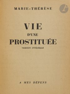 COINTRE (Marie-Thérèse). — Vie d’une prostituée. Version intégrale. — S.l. : à mes dépens — [René Bertelé], [1948]. — In-16, 159 x 120 : (4 ff.), 101 pp., couverture imprimée. Broché.