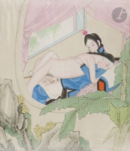 Ensemble de 6 peintures pornographiques sur soie montées sous passe partout de toile ocre, représentant des scènes de couples. Les femmes figurant sur ces dessins représentaient généralement des courtisanes.