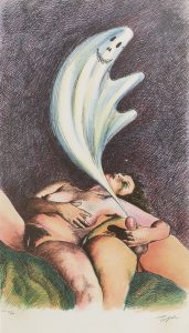 Album tiré à 175 exemplaires sur papier vélin, comprenant deux compositions en noir, sur le titre et sous la justification, et 8 très grandes lithographies libres en couleurs de Roland Topor, toutes signées et justifiées par l’artiste.