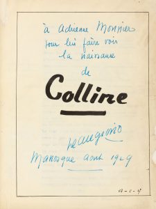 Grâce au succès de Colline, Giono avait pu acquérir sa maison de Manosque, "Lou Paraïs", où il reçut la libraire Adrienne Monnier en août 1929 — comme cet envoi autographe nous l'apprend. Ce même été, celle-ci avait publié la traduction en français d'Ulysse.