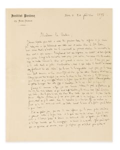Les célèbres travaux de Pasteur sur la prophylaxie de la rage ont complètement renouvelé l'étude de cette maladie. De sa fine écriture, le scientifique répond à la comtesse Greffulhe, ayant demandé de vacciner ses chiens favoris et suggéré de généraliser cette pratique. Il présente ses objections et entretient sa correspondance sur la récente guérison d'une jeune femme mordue. Cette lettre sur la rage montre que le chercheur était attentif aux avancées de la recherche à l'international.