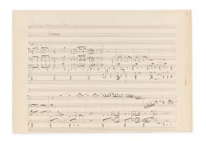 systèmes de quatre portées chacun, sans orchestration ni désignation instrumentale, encre brune foncée (presque noire), contient des motifs et des rythmes distinctifs utilisés dans le premier mouvement de Images, "Par les rues et par les chemins" dix-sept mesures de musique, sous chemise demi-maroquin rouge moderne.