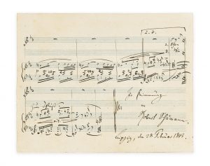 SCHUMANN (Robert) — MANUSCRIT AUTOGRAPHE DU LIED ERSTES GRÜN OP. 35 N° 4, signé et annoté par le compositeur à la fin Zur Erinnerung an Robert Schumann. Leipzig, den 28 Februar 1843. 2 pages in-12 oblong (119 x 150 mm), papier à 8 portées...
