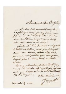 Je suis très reconnaissant de l'appel que vous voulez bien me faire en m'invitant à me joindre à un auditoire auquel vous devez lire une œuvre de vous [...] mais j'ai le regret de me voir encore retenu chez moi, par une indisposition qui me prive, depuis plus de deux mois, de toute réunion. Il lui envoie donc ses excuses et les vifs regrets que j'éprouve.