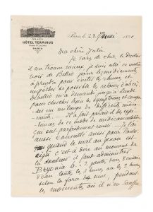 PISSARRO (Camille) — LETTRE AUTOGRAPHE SIGNÉE À SA FEMME JULIE, datée Paris 22 mai [18]91, 3 pages in-8 (208 x 135 mm) sur papier à en-tête de l'hôtel Terminus, sous chemise demi-maroquin bleu moderne.