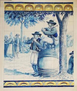 Attribué à Eugène GAUGUET (Quimper 1872-1943) Peintre et graveur. — Fête bretonne au son du biniou et de la bombarde. Maquette réalisée à la gouache et à l'aquarelle, certainement pour la réalisation d'un carrelage de faïence peut-être...