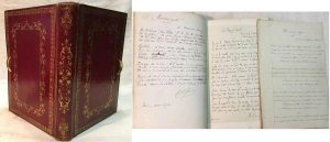 Le livre est recouvert d'une pleine basane richement décorée avec trace de fermoir, auquel sont joint divers courriers et pages manuscrites volantes.