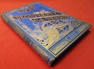 Jules VERNE. — Découverte de la Terre. — Paris, Bibliothèque d'Education et de Récréation J. Hetzel, sd. (1878), in-4 relié plein cartonnage bleu cobalt à la sphère armillaire ptolémaïque par Engel avec une plaque de Souze, tranches dorées.