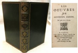 Michel BARON. — Les œuvres de M. Baron. — Paris, Pierre Ribou, 1704, in-12 relié plein maroquin vert signé de Hardy-Menne avec triple filet d'encadrement sur les plats, dos à nerfs richement décoré au petit fer, double filet sur les coupes,...