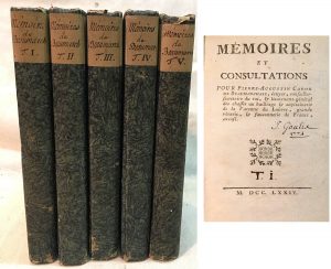 Mémoire à consulter (209pp.), Supplément au Mémoire et consultation et Requête d'Atténuation (206 pp. avec restauration au dernier feuillet), Quatrième Mémoire à consulter pour Beaumarchais ... contre M. Goezman et Consultation (213 pp.), Mémoire à consulter et consultation pour Beaumarchais (XX, 165 et 3 pp.d'errata) et Suite des Mémoires de Beaumarchais ou Réponse ingénue à la consultation injurieuse que le Comte Joseph-Alexandre Falcoz de La Blache a répandue dans Aix (204 et 48 pp.)