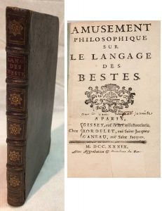 Guillaume Hyacinthe BOUGEANT. — Amusement philosophique sur le langage des bestes. — Paris, Gissey, Bordelet, Ganeau, 1739, in-12 relié plein veau, dos à nerfs orné de fleurons, pièce de titre, un mors fendillé, découpe en bas du titre.