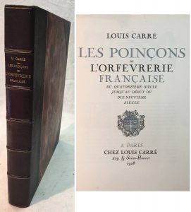 Louis CARRE. — Les Poinçons de l'Orfèvrerie française, du quatorzième siècle au début du dix-neuvième siècle. — Paris, Carré, 1928, in-4 relié demi-chagrin à coins, dos à nerfs, couverture conservée, tête dorée.