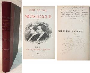 COQUELIN Aîné et Cadet. — L'art de dire le monologue. — Paris, Ollendorff, 1884, relié demi-chagrin rouge signé de Maillet, dos à nerfs. Édition originale contenant un envoi autographe des deux Coquelin au galeriste et marchand d'art...